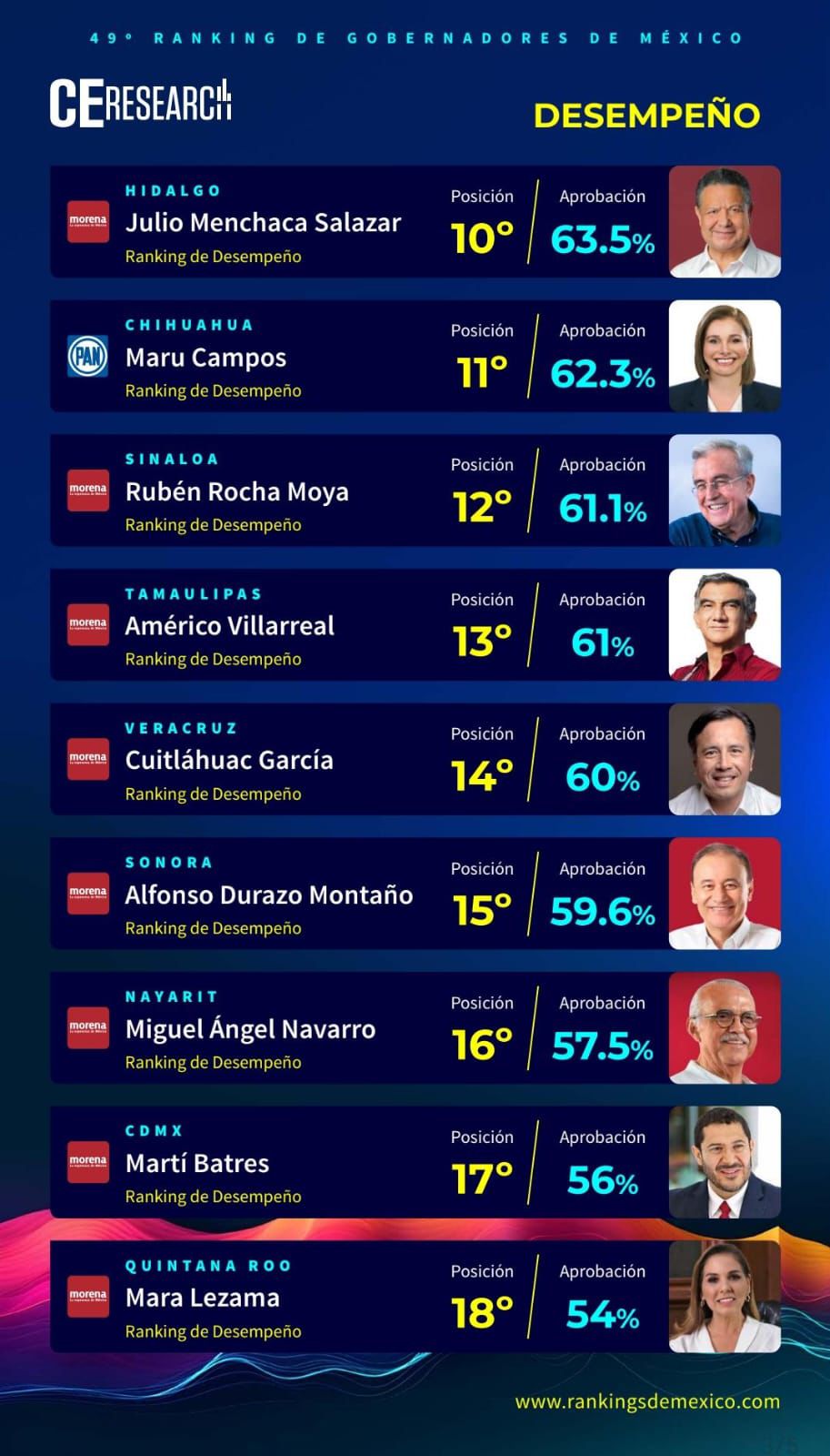 Del mismo modo, García Jiménez es el sexto gobernador proveniente del partido de Movimiento Regeneración Nacional (MORENA) con mejor práctica durante su función ubicándose en la posición 14, lo que lo ubica en el top ten de gobernantes morenistas.