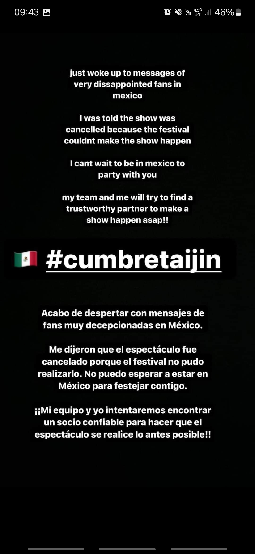 “Acabo de despertar con mensajes de fans muy decepcionados en México. Me dijeron que el espectáculo fue cancelado porque el festival no pudo realizarlo. No puedo esperar a estar en México para festejar contigo”.