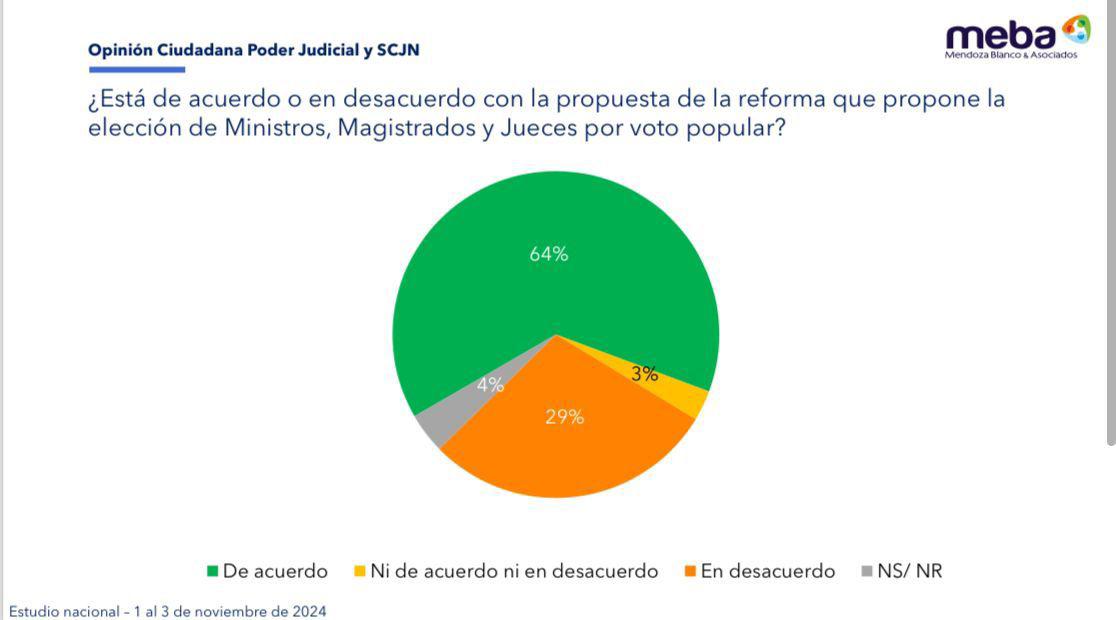 En cuanto a la reforma al Poder Judicial, 68% de la población afirma haber escuchado o leído sobre la reforma. Y, en cuanto a la propuesta de elección de ministros, magistrados y jueces por voto popular, 64% se muestra favorable, mientras que 29% se opone a la medida.