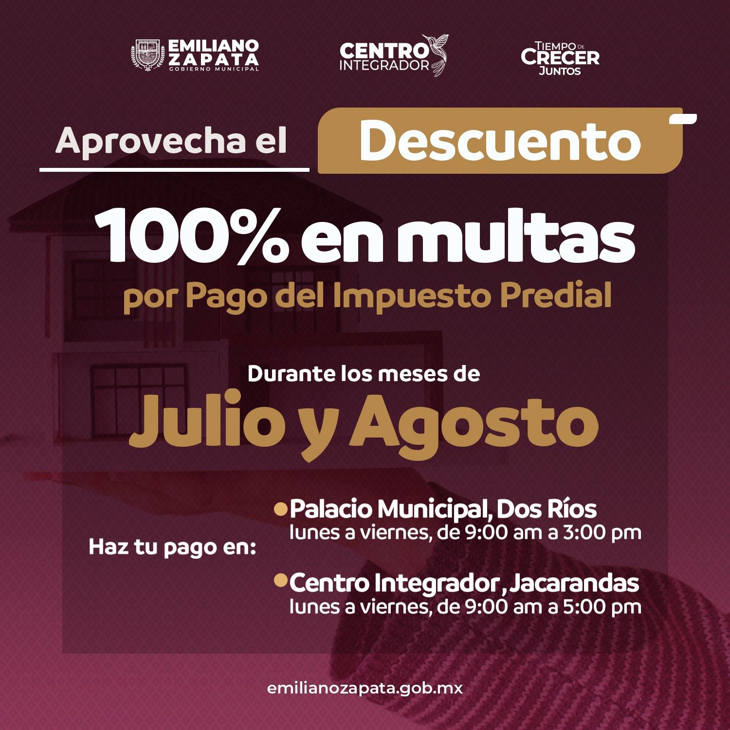 Emiliano Zapata, Ver.- Para quienes aún no realizan el pago del impuesto predial, el Ayuntamiento de Emiliano Zapata, encabezado por el presidente municipal Erick Ruíz Hernández, otorgará durante los meses de julio y agosto el 100 por ciento de descuento en multas.