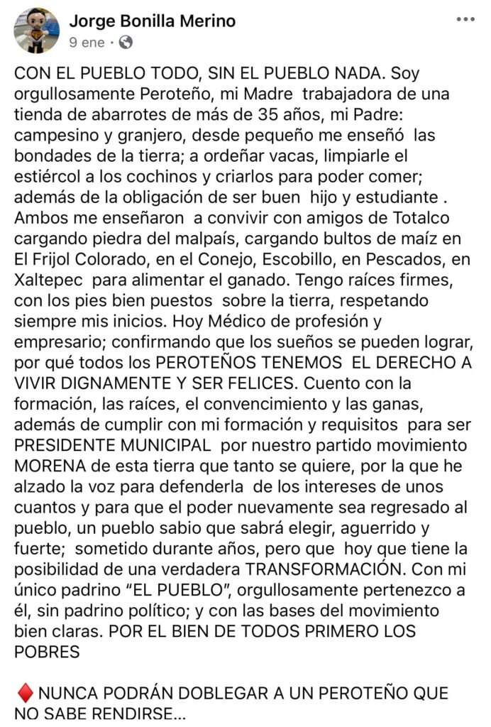 Si bien, Bonilla Merino ha cumplido con el pago que tenía atrasado y la demanda que inició en el año 2017, en el mes de enero se registró ante Morena, diciendo contar con todos los requisitos de la ley para ser candidato.