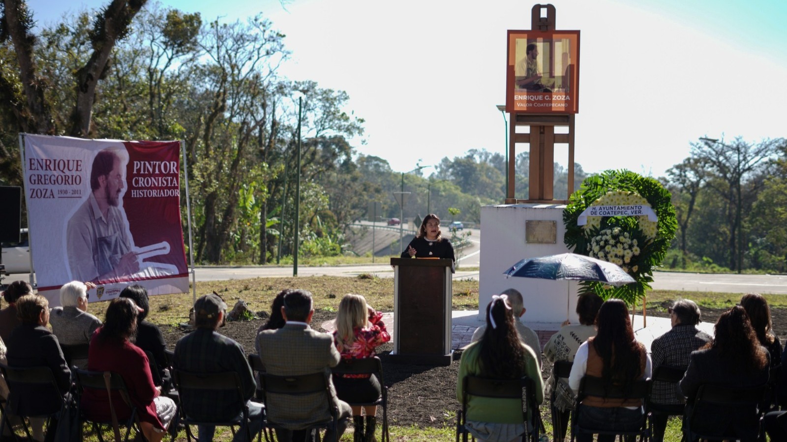 Coatepec, Ver., 25 de febrero de 2026.- El crucero de la carretera a Zimpizahua fue escenario del homenaje por el XV aniversario luctuoso de Enrique Gregorio Zoza (1930–2011), figura central en la vida cultural del municipio.