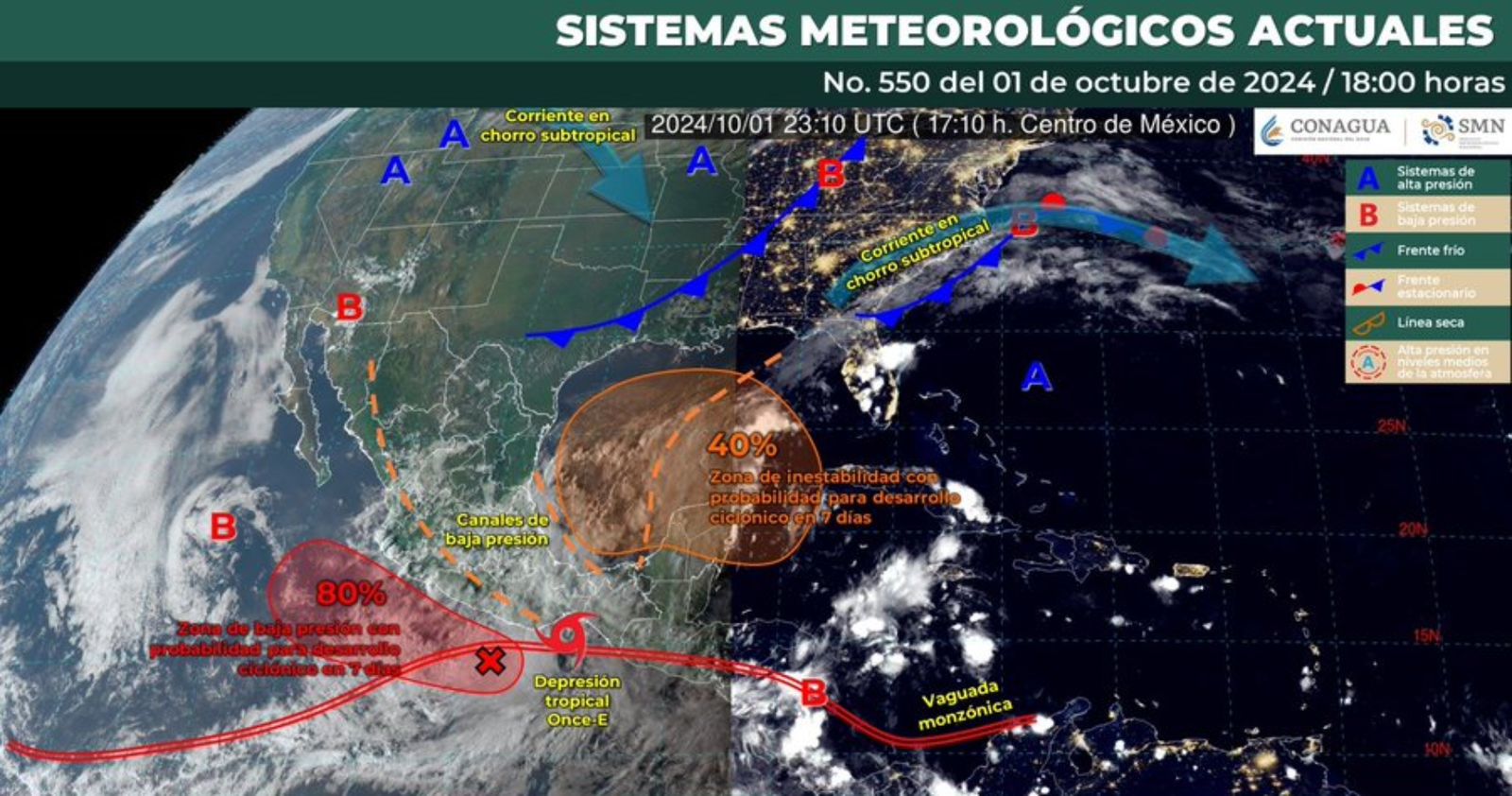 La Comisión Nacional del Agua (CONAGUA) emitió un comunicado en las primeras horas del 2 de octubre, alertando sobre la intensificación de la depresión tropical Once-E, que podría convertirse en tormenta tropical en las próximas horas. Actualmente, el meteoro se localiza a 55 kilómetros al sureste de Bahías de Huatulco y a 80 kilómetros de Puerto Ángel, en Oaxaca, con vientos de 55 km/h y rachas de hasta 75 km/h.