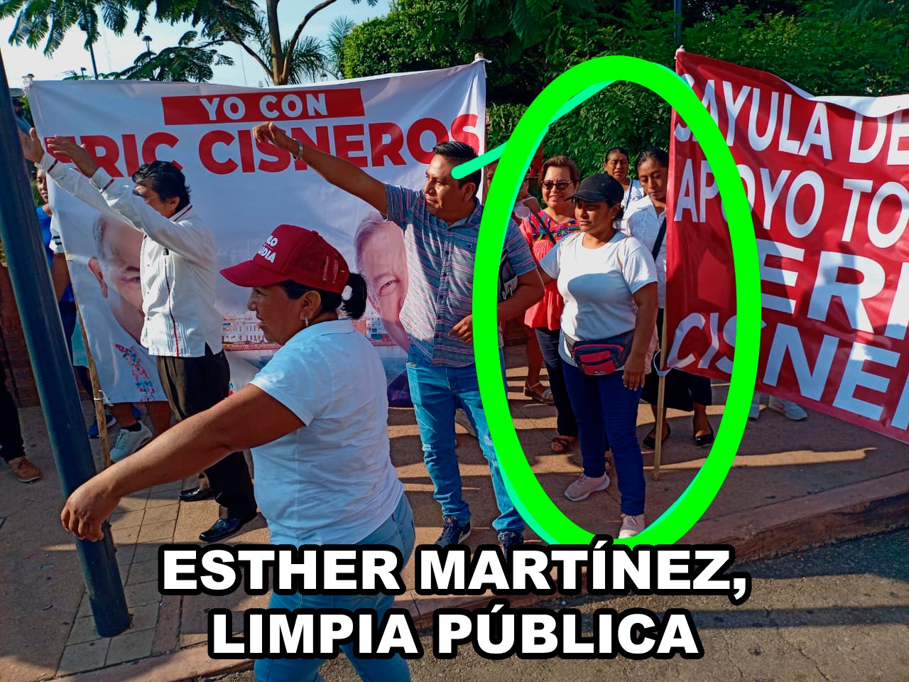 En el evento se pudo ver a la secretaria particular de la alcaldesa, Estrella Aguilar, quién andaba de dama de compañía de Cisneros Burgos y no se le despegó en ningún momento, así como a Emanuel Guerrero, director de Comercio en Sayula de Alemán, quién se la pasó cargando banderas, lonas y cartulinas en favor de el de Otatitlán, así como a Gerónima Pavón, del área de Limpia pública en palacio y asu subordinada, Esther Martínez.