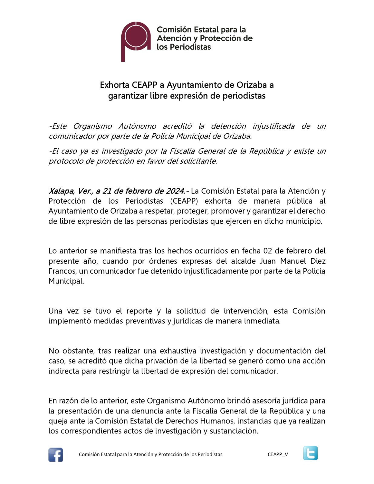 Xalapa, Ver., a 21 de febrero de 2024.-La Comisión Estatal para la Atención y Protección de los Periodistas (CEAPP) exhorta de manera pública al Ayuntamiento de Orizaba a respetar, proteger, promover y garantizar el derecho de libre expresión de las personas periodistas que ejercen en dicho municipio.
