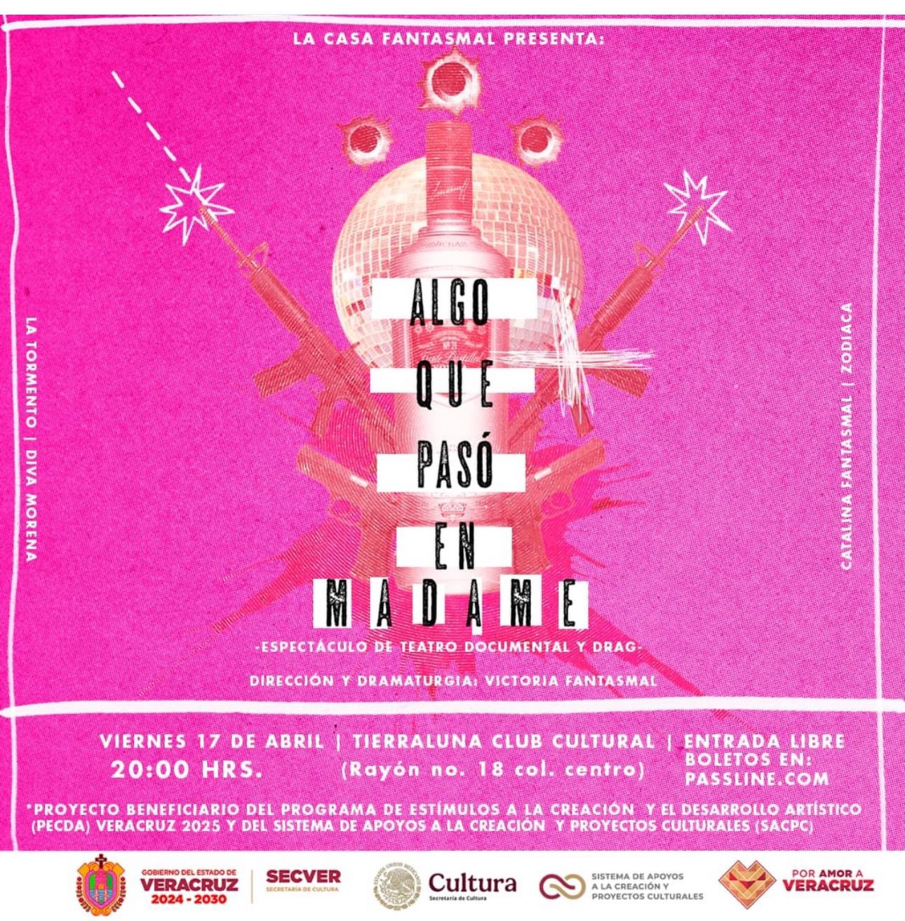 Xalapa, Ver.- Victoria Fantasmal, junto a sus compañeras drags integrantes del colectivo “La Casa Fantasmal”, presentarán su más reciente proyecto: «Algo que pasó en Madame», un espectáculo que fusiona el rigor del teatro documental con la expresividad del Show Drag, función que se llevará a cabo en el escenario de Tierra Luna Club Cultural este viernes 17 de abril, en punto de las 20:00 horas.