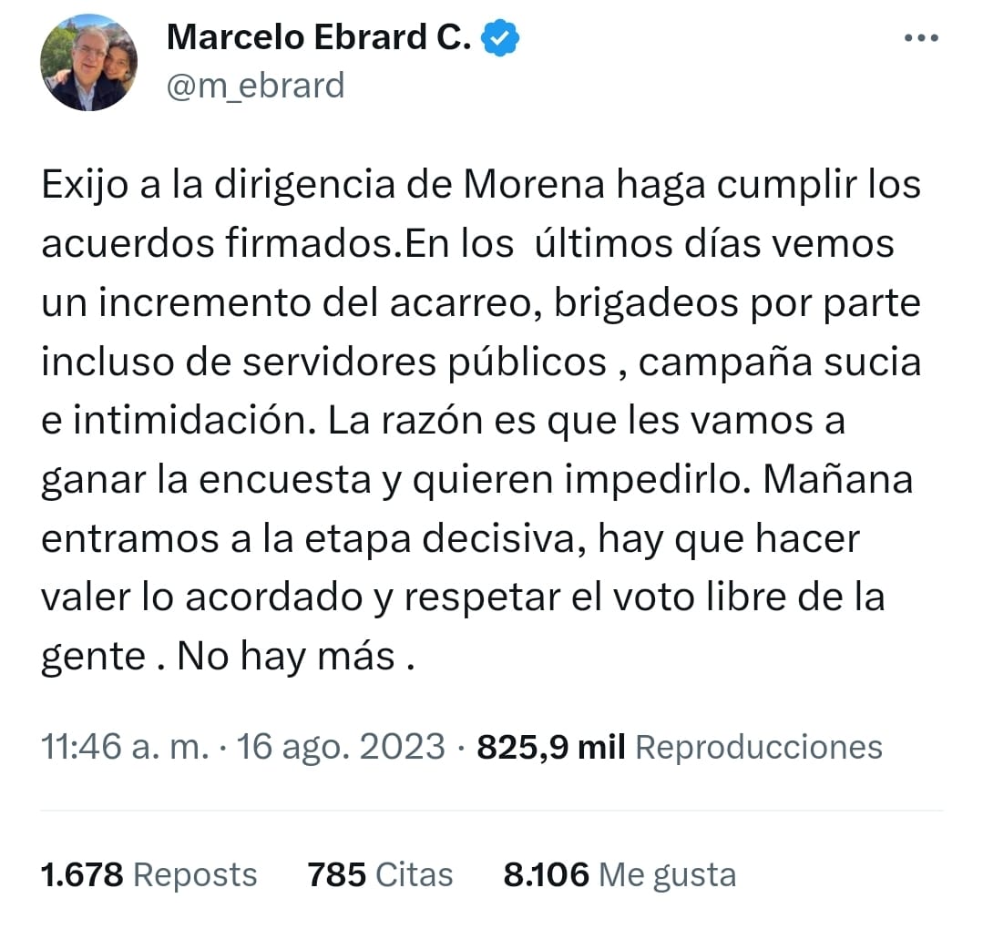 “Nunca habíamos visto tanto acarreo, tanta paga de encuestas falsas, no había visto campaña negra incluso contra mi familia”, acusó Ebrard ante medios de comunicación.