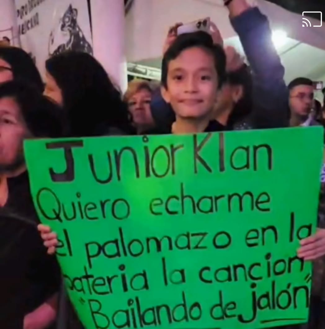 “Junior Klan quiero echarme el palomazo en la batería la canción Bailando de Jalón”, se le en la cartulina que sostenía el pequeño.
