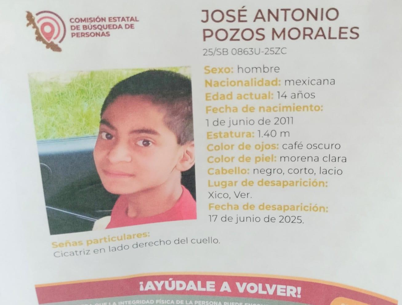 José Antonio Pozos Morales, de 14 años, fue visto por última vez el martes 17 de junio en su casa en Jico, Veracruz. Vestía ropa casual y salió sólo a comprar en una tienda cercana. Si alguien tiene información que ayude a dar con su paradero, se solicita comunicarse de inmediato al 911 o con la Fiscalía General del Estado.