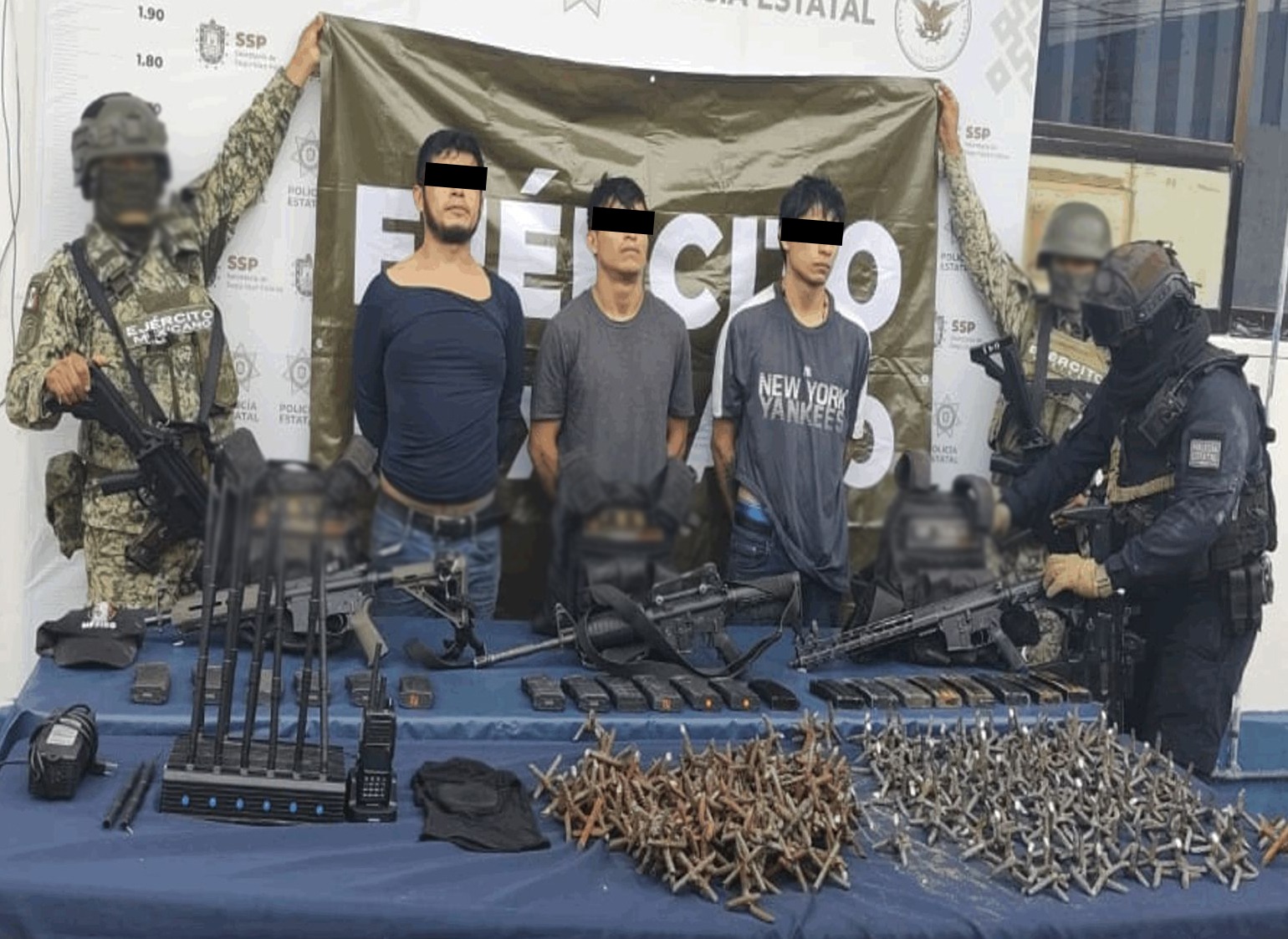 - Se aseguraron tres armas largas, 22 cargadores, tres chalecos tácticos y un inhibidor de señal.