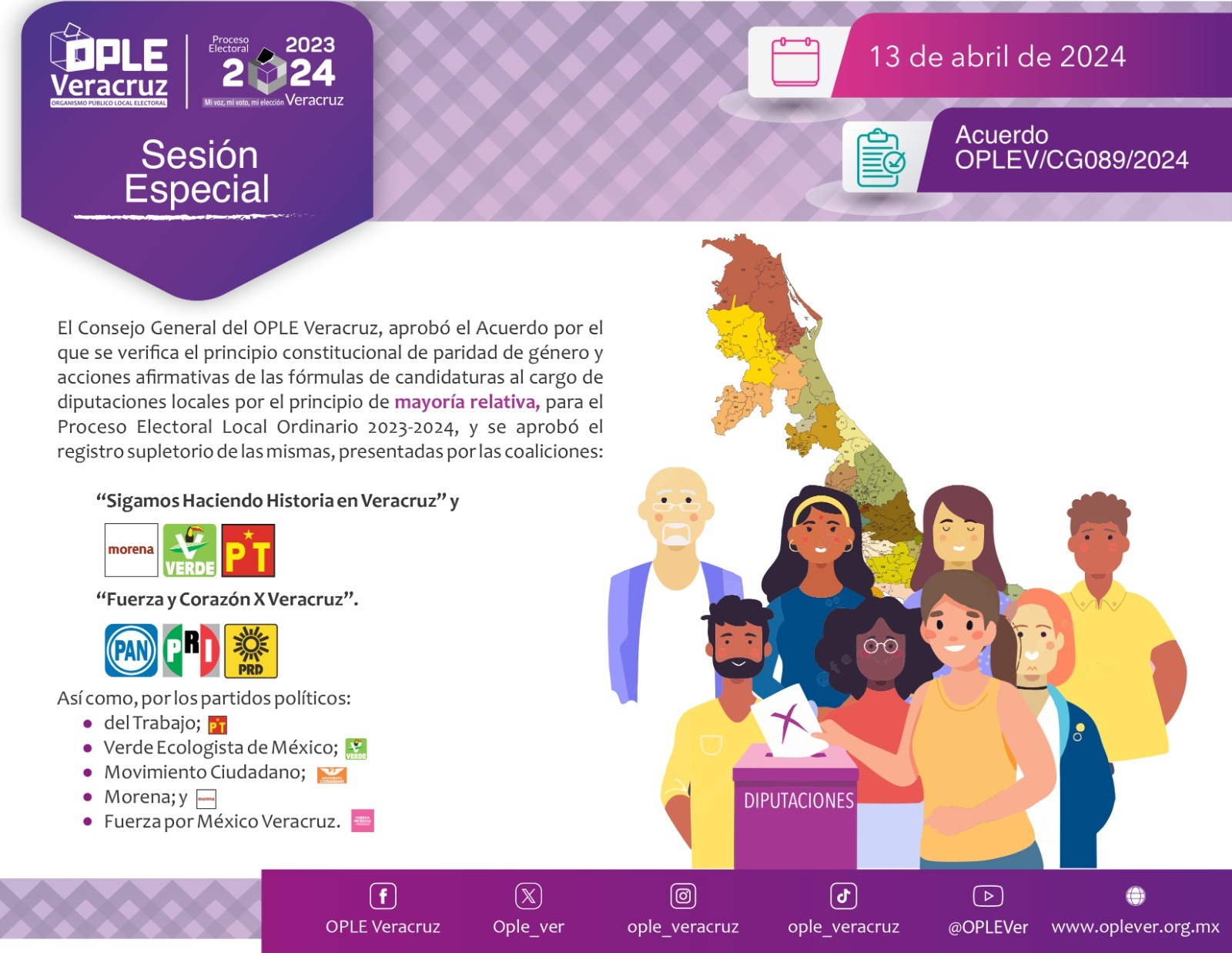 Xalapa, Veracruz, 13 de abril de 2024. En Sesión Especial, el Consejo General del Organismo Público Local Electoral del Estado de Veracruz (OPLE Veracruz) aprobó por unanimidad los acuerdos en los que se verificaron el principio constitucional de paridad de género y acciones afirmativas de las fórmulas de candidaturas al cargo de diputaciones por el principio de Mayoría Relativa, presentadas por la Coalición Parcial “Sigamos Haciendo Historia en Veracruz”, conformada por los partidos políticos nacionales: Morena, del Trabajo y Verde Ecologista de México, así como la Coalición “Fuerza y Corazón por Veracruz”, conformada por los Partidos Políticos nacionales: Acción Nacional, Revolucionario Institucional y de la Revolución Democrática; y los partidos políticos Movimiento Ciudadano y Fuerza por México Veracruz; y las postulaciones individuales de los partidos políticos del Trabajo, Verde Ecologista de México y Morena en los distritos electorales locales: 04 Álamo y 16 Boca del Río.