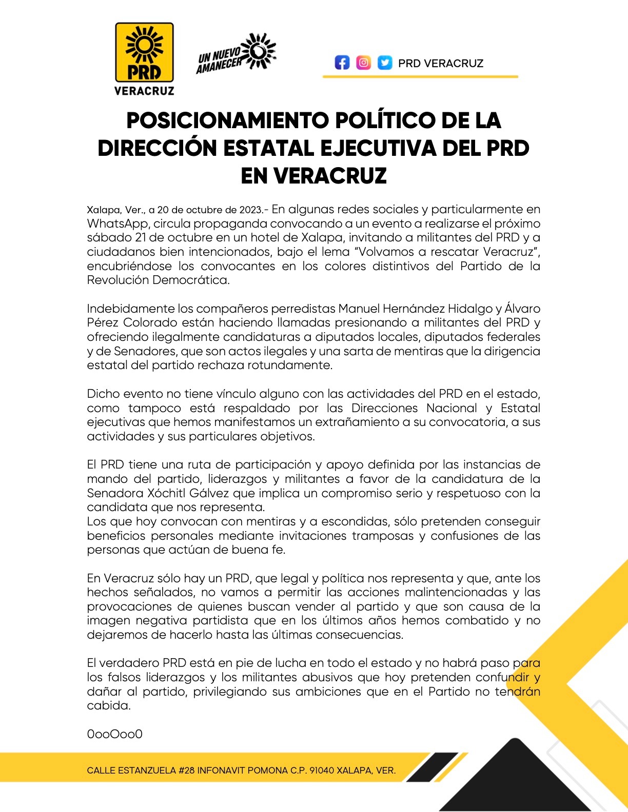En Veracruz sólo hay un PRD, que legal y política nos representa y que, ante los hechos señalados, no vamos a permitir las acciones malintencionadas y las provocaciones de quienes buscan vender al partido y que son causa de la imagen negativa partidista que en los últimos años hemos combatido y no dejaremos de hacerlo hasta las últimas consecuencias.