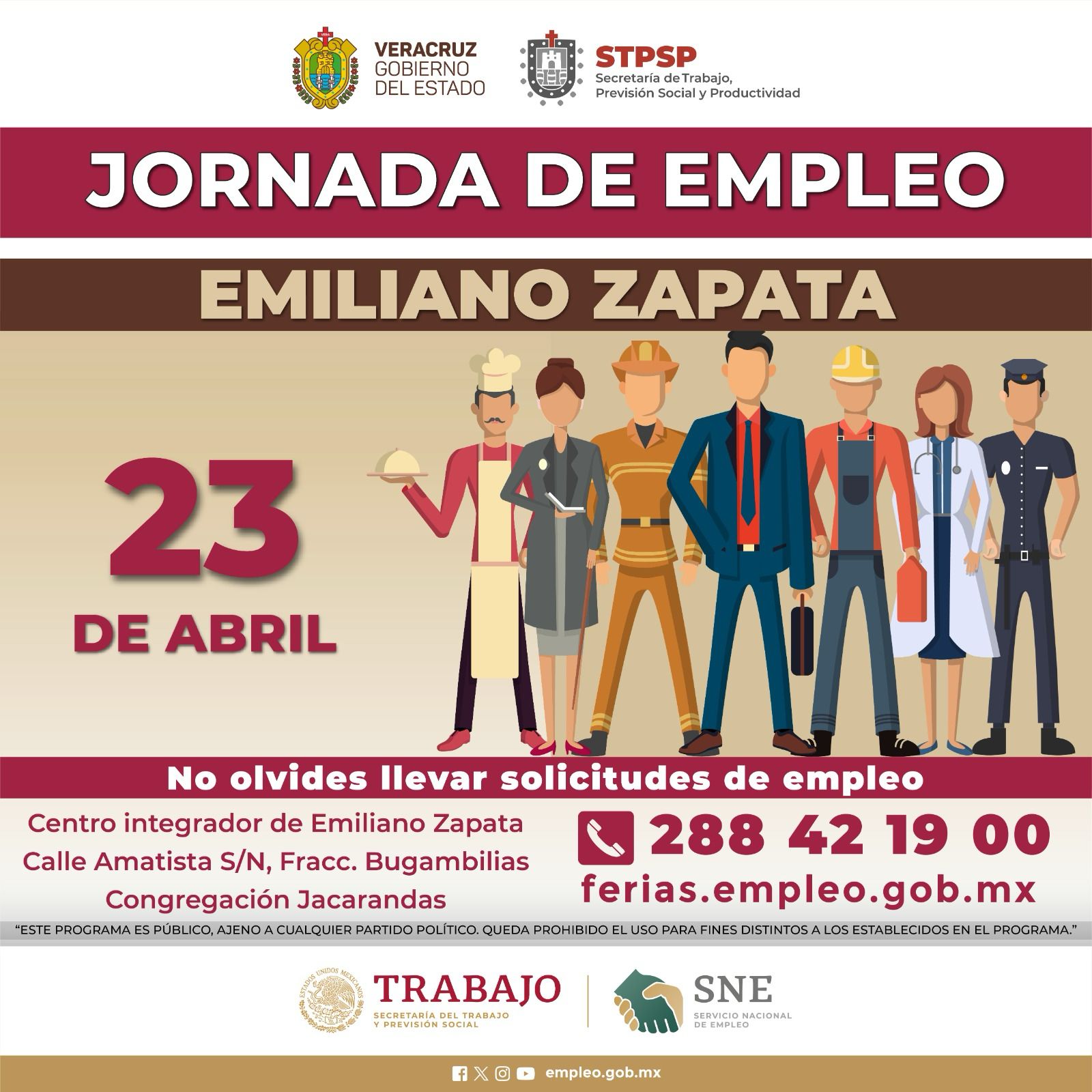 Emiliano Zapata, Ver.- En coordinación con el Ayuntamiento de Emiliano Zapata, la Secretaría de Trabajo, Previsión Social y Productividad (STPSP) de Veracruz llevará a cabo la primera Jornada de Empleo en el municipio este 23 de abril para que las personas interesadas en una vacante laboral puedan conocer las opciones que ofrece el Servicio Nacional de Empleo (SNE).