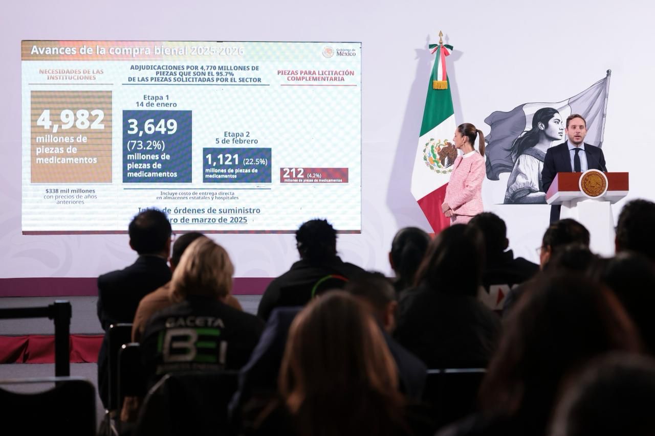 - Como parte de la Compra Consolidada de Medicamentos e Insumos Médicos 2025-2026 se adjudicó con éxito el 95.7 por ciento de los 4 mil 982 millones de piezas necesarias; en marzo comienza el abasto en hospitales y clínicas