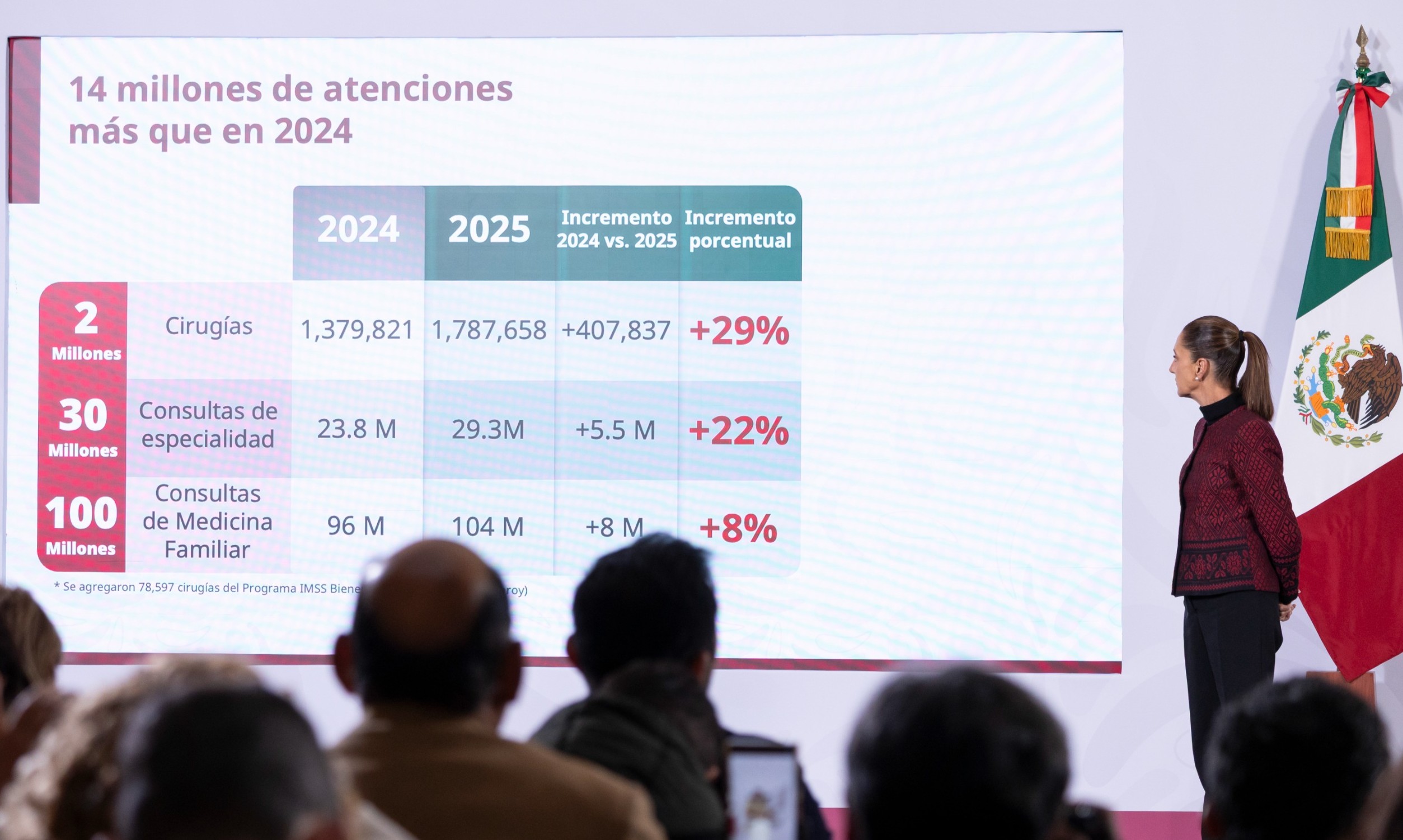 PRESIDENTA CLAUDIA SHEINBAUM DESTACA INCREMENTO DE CIRUGÍAS Y CONSULTAS DE ESPECIALIDAD EN IMSS, IMSS BIENESTAR E ISSSTE EN 2025; SE TRABAJA EN SERVICIOS UNIVERSALES DE SALUD
