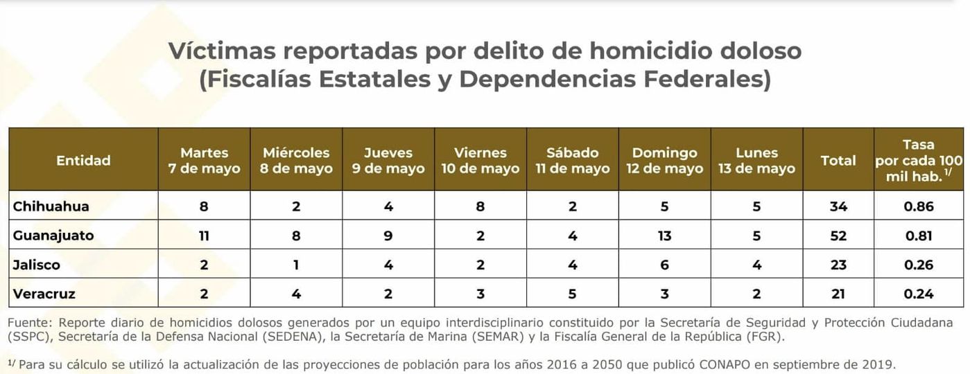 Xalapa, Ver.- En el reporte semanal de víctimas por delito de homicidio doloso, Veracruz se mantiene por debajo de estados como Chihuahua, Guanajuato y Jalisco, con 21 casos registrados por cada 100 mil habitantes.