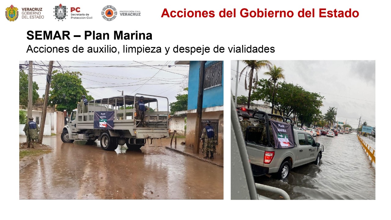 Reportó que, en Veracruz, se contabilizaron nueve colonias con anegamientos debido a drenajes obstruidos: Amapolas, Astilleros, Chivería, Dos Caminos, Fénix, Floresta, La Florida, Las Bajadas y Las Brisas. Además, por un deslizamiento en Geo Villas Los Pinos dos viviendas y un patio de maniobras de autobuses fueron evacuados.