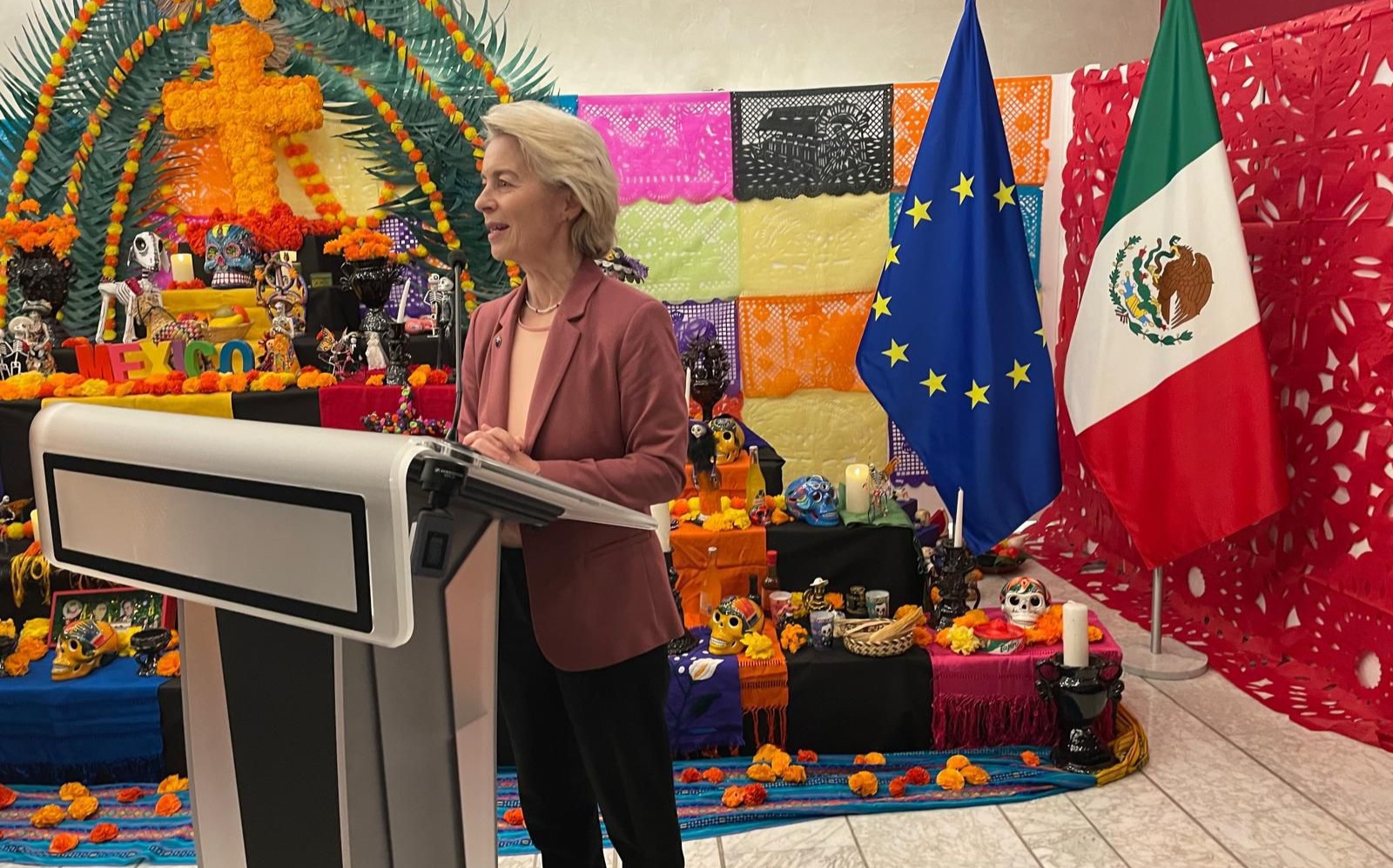 Úrsula van der Leyden cerró su discurso con un emotivo grito de |Viva México! Que dio pauta a la entrada de un conjunto de mariachis que entonaron piezas tradicionales, en tanto legisladores, embajadores e invitados admiraban el Altar de Muertos ubicado en el vestíbulo del imponente edificio parlamentario.