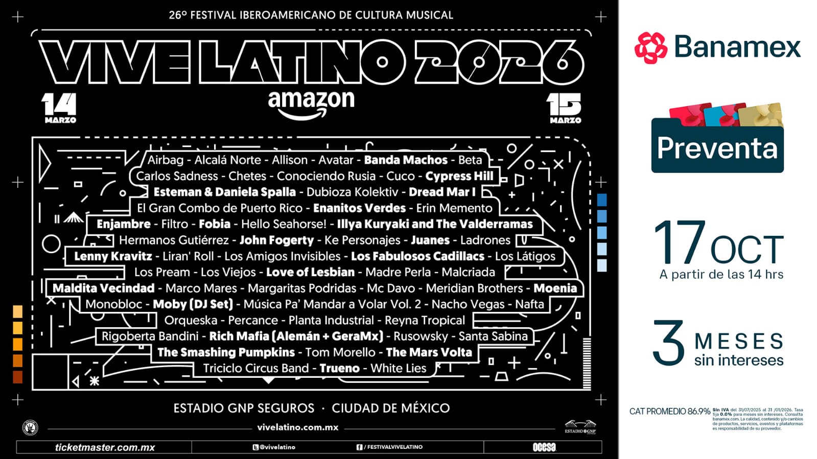 El lineup que estás esperando ya está aquí: AIRBAG, ALCALÁ NORTE, ALLISON, AVATAR, BANDA MACHOS, BETA, CARLOS SADNESS, CHETES, CONOCIENDO RUSIA, CUCO, CYPRESS HILL, DREAD MAR I, DUBIOZA KOLEKTIV, EL GRAN COMBO DE PUERTO RICO,ENANITOS VERDES, ENJAMBRE, ERIN MEMENTO, ESTEMAN & DANIELA SPALLA, FILTRO, FOBIA, HELLO SEAHORSE!, HERMANOS GUTIERREZ,ILLYA KURYAKI AND THE VALDERRAMAS, JOHN FOGERTY,JUANES, KE PERSONAJES, LADRONES, LENNY KRAVITZ, LIRAN’ ROLL,LOS AMIGOS INVISIBLES, LOS FABULOSOS CADILLACS, LOS LÁTIGOS,LOS PREAM, LOS VIEJOS, LOVE OF LESBIAN, MADRE PERLA, MALCRIADA,MALDITA VECINDAD, MARCO MARES, MARGARITAS PODRIDAS, MERIDIAN BROTHERS, MC DAVO, MOBY (DJ SET), MOENIA, MONOBLOC,MÚSICA PA’ MANDAR A VOLAR VOL. 2, NACHO VEGAS, NAFTA, ORQUESKA,PERCANCE, PLANTA INDUSTRIAL, REYNA TROPICAL, RICH MAFIA,RIGOBERTA BANDINI, RUSOWSKY, SANTA SABINA, THE SMASHING PUMPKINS, THE MARS VOLTA, TOM MORELLO, TRICICLO CIRCUS BAND, TRUENO y WHITE LIESVive Latino 2026:
